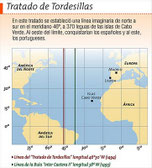 Pero casi nadie contaba con que la empresa de Colón, financiada finalmente por la reina castellana, pudiera llegar a tan buen fin como parecía. En 1493 surgía, así, un nuevo problema dipolmático: ¿de quién eran los nuevos territorios encontrados por el navegante genovés? Los Reyes Católicos consiguieron el apoyo del Papa español Alejandro VI, que les concedió, por medio de otras dos bulas, los territorios conquistados por Colón, siempre que no pertenecieran ya a otros príncipe cristiano -de esta forma, quedaban protegidas las conquistas previas portuguesas. Una línea imaginaria trazada a cien leguas al oeste de las Azores sería el límite: la parte occidental para Castilla, la oriental para Portugal.